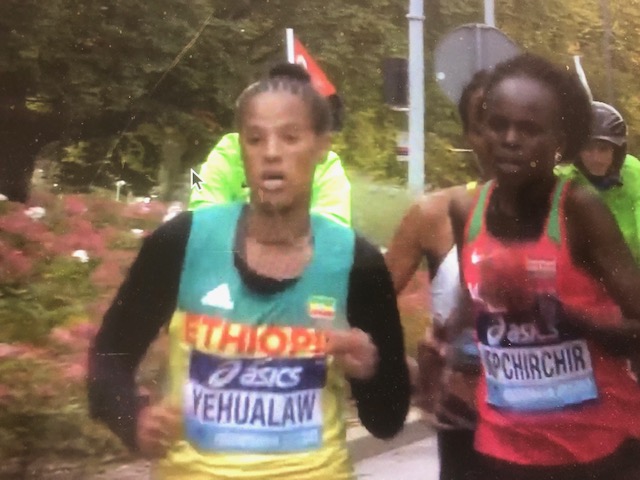 Snabbast av alla var Jepchirchir som satte nytt världsrekord med tiden 1.05.14, tvåa var Kejeta med 1.05.16 och bronset tog Yehualaw med 1.05.19. Fram till 2 km innan mål var det 7 tjejer i täten, men en ramlade och drog med sig flera i fallet, då passade Yehualaw på att öka tempot och topptrion gled bort. På upploppet snubblade dock Yehualaw till och blev passerad.